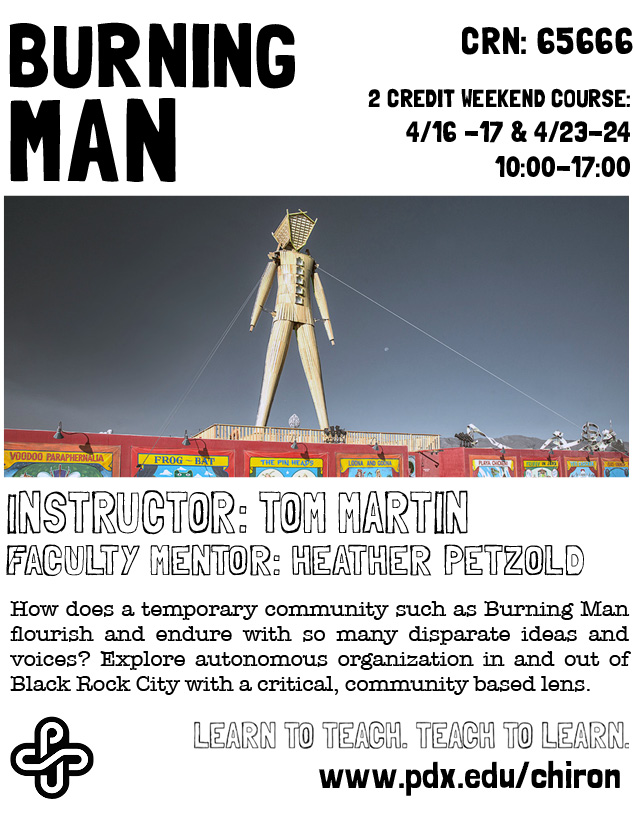 How does a temporary community such as Burning Man flourish and endure with so many disparate ideas and voices? In this weekend intensive course, we will explore autonomous organization in and out of Black Rock City through a critical, community-based lens.